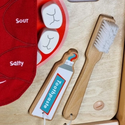 Denne interaktive læringsressource udvikler finmotorik, logisk tænkning og sundhedsfaglig viden hos børn. Den store bevægelige tunge med markerede smagszoner og et sæt madvarer med velcro gør læringen til en sjov leg. Der medfølger realistiske tilbehør – tandbørste, tandpasta og tandtråd.