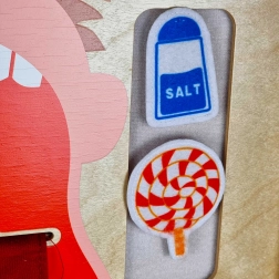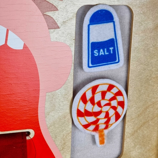 Den store bevægelige tunge med tydeligt markerede smage og madvarer med velcro lærer børn at skelne mellem sød, salt, sur og bitter smag.