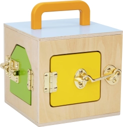 - Låseboks med 3 forskellige låse, 8 træsten, træ-vejrplade, sæt til tælling 1–10, malebog Dyr Niveau 1, 6 bløde farveblyanter, bogen “Jeg er 3 år”, forældreguide