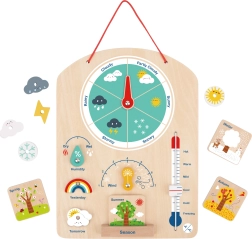 Børn kan ved hjælp af drejelige visere registrere det aktuelle vejr, temperaturen og årstiden. En skøn rutine til morgen- og aftenstundens samtaler og til at udvide ordforrådet.
