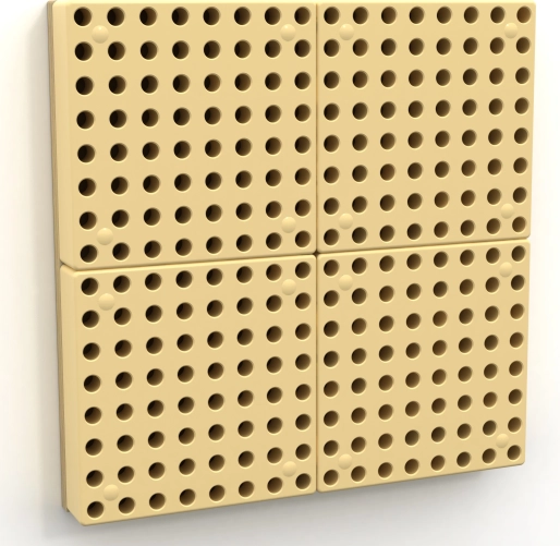 Den perforerede plade bestående af 4 dele på 20 × 20 cm gør det muligt at indsætte farvede pinde og skabe originale mønstre, som udvikler finmotorik og fantasi.