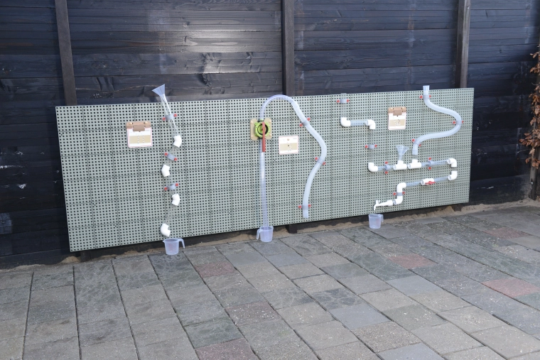 Sæt rør, tragte og kopper fast og skab din egen vandbane. Børn forstår visuelt vandets flow og årsag–virkning.