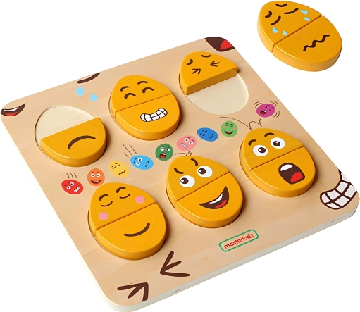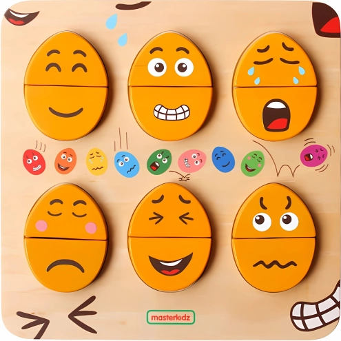 Runde dele med forskellige ansigtsudtryk hjælper børn med at forstå glæde, tristhed, overraskelse og andre følelser. Ideel til udvikling af emotionel intelligens og kommunikation.