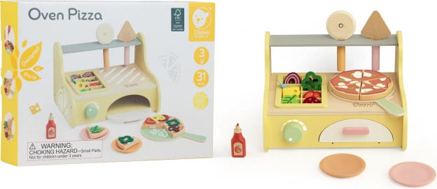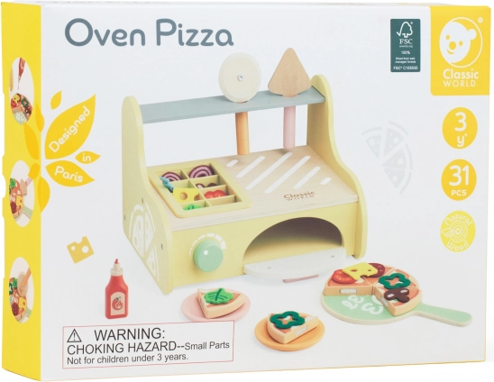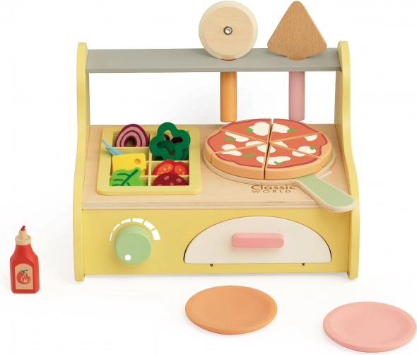 Træpizzaovnen CLASSIC WORLD er et kreativt legetøj til børn fra 3 år, som udvikler finmotorik og fantasi. Sættet indeholder en “bageovn”, en pizza med a aftagelige filt-ingredienser, en drei-knap, tallerkener og tilbehør til servering. Børn kan lege kok, træne rolleleg, øje-hånd-koordination og opleve glæden ved kreativ pizzatilberedning.