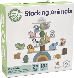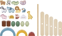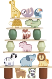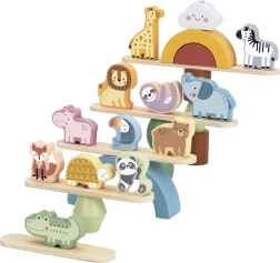 Trædyr til stabling er det ideelle legetøj til at udvikle børns kreativitet. Sættet indeholder 12 søde trækdyr og 16 balanceelementer, såsom træbue, sten, platforme og en sjov sky.