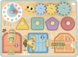 Brættet indeholder tre forskellige låse, bag hvilke der gemmer sig dyrebilleder, der stimulerer børns fantasi og nysgerrighed.