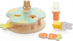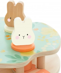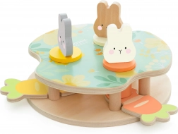 Legetøjet indeholder tre farverige kaniner, som barnet indsætter i platforme efter form og farve. Når guleroden trykkes, springer de frem!