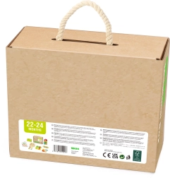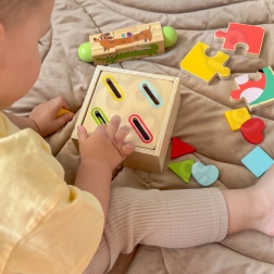 Sikker udførelse i træ og tekstil, mættede farver og en kompakt æske med håndtag gør det til en praktisk gave til hverdagen. Børn leger, sorterer, bygger og udforsker – og udvikler samtidig naturligt de færdigheder, der er nødvendige for videre læring.