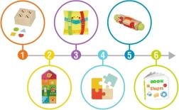Seks læringsaktiviteter i én boks udvikler finmotorik, hånd–øje-koordination, logisk tænkning og genkendelse af former og farver – med fokus på barnets selvstændighed.