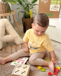 - Form-sorter (16 brikker/4 former), pude med spænder, stabletårn (5 niveauer, 15 brikker), drejepuslespil med dyr, dobbeltsidet puslespil, bog om former