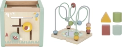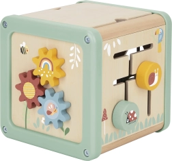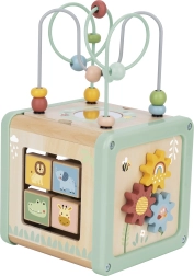 På oversiden finder du en motorisk labyrint med perler og et sikkert spejl, og på siderne form-sorter, roterende klodser med dyr, tandhjul og skinnebaner. Hver side giver en ny udfordring, så barnet øver tålmodighed, kreativitet og problemløsning.