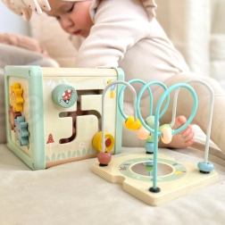 Toppen af kuben byder på farvede perler, der kan skubbes langs buede metaltråde og udvikler koordination og finmotorik. Spejlet vækker nysgerrighed og selvopfattelse.