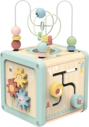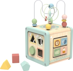 Denne multifunktionelle trækube understøtter barnets naturlige udvikling gennem meningsfuld leg. Pastelfarverne fanger opmærksomheden, mens de mange aktiviteter træner finmotorik, hånd-øje-koordination, logisk tænkning og genkendelse af former og farver.