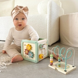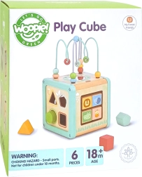 Den træbaserede aktivitetskube WOOPIE GREEN i blide pastelfarver kombinerer leg og læring i ét. Den tilbyder perlelabyrint, form-sorter, roterende klodser med dyr, tandhjul og skydemekanismer, som styrker finmotorik, logik og koordination. Det sikre design med glatte kanter og kvalitets træ er et ideelt valg til børn fra 18 måneder og som en fantastisk gave.