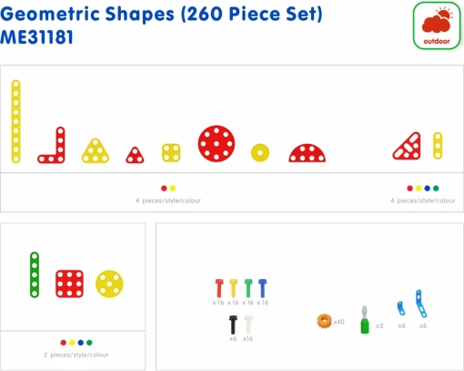 - Geometriske former (kvadrater, trekanter, cirkler, halvcirkler), flade bånd, 96 skruer (flere farver), 40 møtrikker, 12 forbindere, 2 skruetrækkere