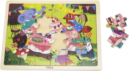 Opdag et kvalitets træpuslespil fra VIGA med temaet fødselsdagsfest. Puslespillet med 24 brikker ligger i en træramme med forlæg, og hver brik er nummereret fra 1 til 24, hvilket gør det lettere for børn at lægge puslespillet og støtter indlæring af tal. Velegnet fra 24 måneder, malet med giftfri farver.