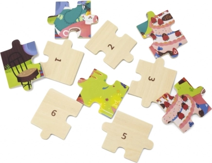 Den sikre udførelse i kvalitets træ og giftfri farver sikrer holdbarhed og sikkerhed ved daglig leg. Temaet med fødselsdagsfest motiverer børn til at fortælle historier og udvikler deres fantasi og ordforråd.