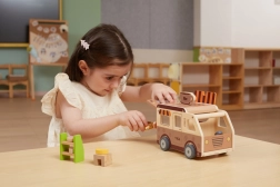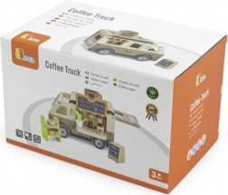 Den træ cafétruck til børn fra VIGA er et gennemtænkt legetøj til små rollelege-entusiaster. Med i sættet er en barista-figur, reol med lækkerier, snacks og udstyr fra kaffe til menutavle. Takket være det løftbare tag, serveringsvinduet og den åbningsbare bagklap forløber legen gnidningsfrit og efterligner ægte kundebetjening.