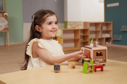 Solidt træ, glatte kanter og slidstærke prints sikrer sikker og langvarig leg for børn fra 3 år.