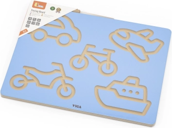Træbaseret grafomotorisk VIGA-tavle med køretøjer. Træner finmotorik, koordination og forberedelse til skrivning med indgraverede riller. Fra 3 år.