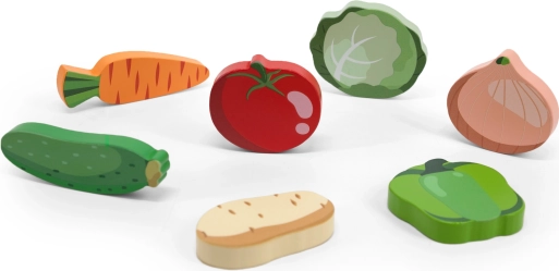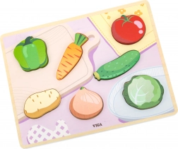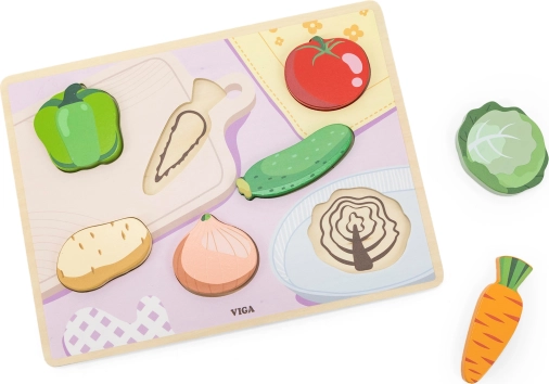 VIGA træ-indlægspuslespil med 7 brikker formet som populære grøntsager (peberfrugt, tomat, gulerod, agurk, kartoffel, kål og løg) tilbyder den ideelle kombination af læring og leg. Børn træner genkendelse af former og farver, øver matchning og styrker på en legende måde hukommelse og koncentration.