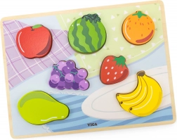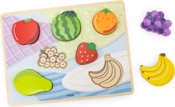 Oplev legende læring med træpuslespillet med frugter fra Viga. Sættet indeholder en solid, farverigt illustreret plade og 7 brikker (æble, melon, appelsin, druer, jordbær, bananer og pære), som børn lægger i de tilsvarende udskæringer. Klare farver og tydelige konturer understøtter genkendelse af former og farver.