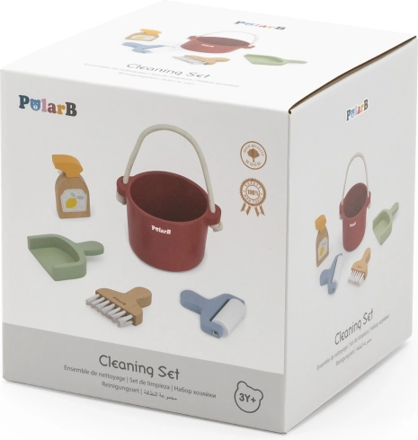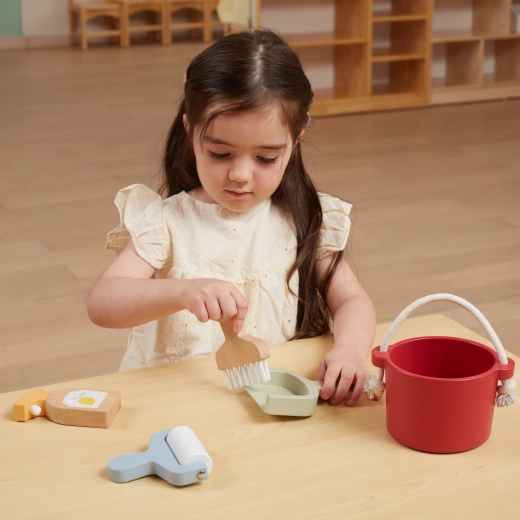 I pakken finder du en spand, kost med fejeblad, en sprayflaske i træ og en rulle – alt hvad barnet behøver til den “store rengøring”. Understøtter fantasi og rolleleg.