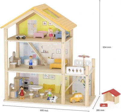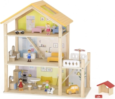 VIGA trædukkehus: 3 etager, 32 dele, møbler, 4 figurer og hund, balkon og garage. Kvalitetstræ, pastelfarver. Fra 3 år.