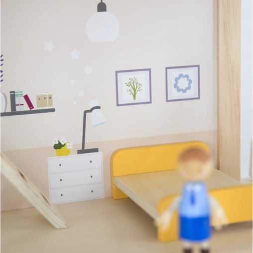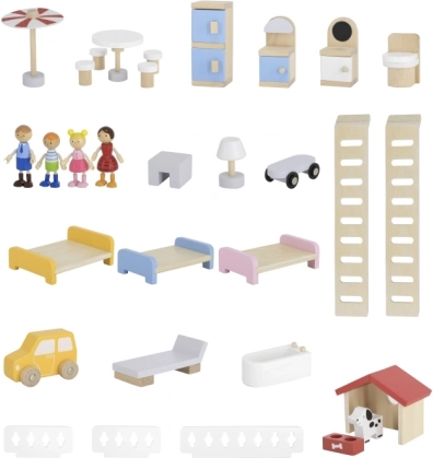 Den robuste trækonstruktion og de glatte kanter gør legen sikker og behagelig. Hele 32 dele stimulerer fantasi, finmotorik og sociale færdigheder. Ideel til dukker op til 10 cm.