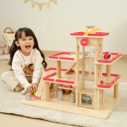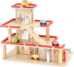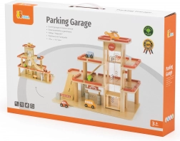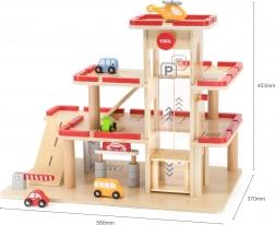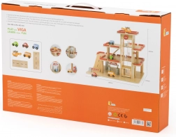 VIGAs trægarage er perfekt til små bil- og flyentusiaster. Tre etager med ramper, manuel elevator og landingsplads til helikopter giver timevis af fantasifuld leg. Den stabile konstruktion og det omhyggelige håndværk gør sættet velegnet til både solo- og gruppeleg.