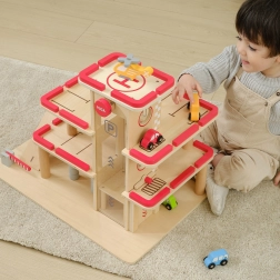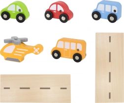 I pakken får du 4 træbiler, en helikopter samt ind- og udkørselselementer. Tydelig markering af parkeringspladser, vaskehal og barrierer understøtter realistiske scenarier og lærer børn koordinationsevner.