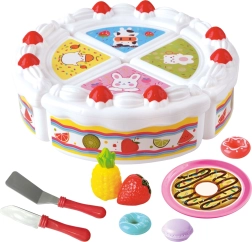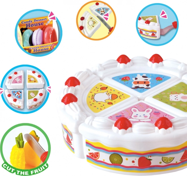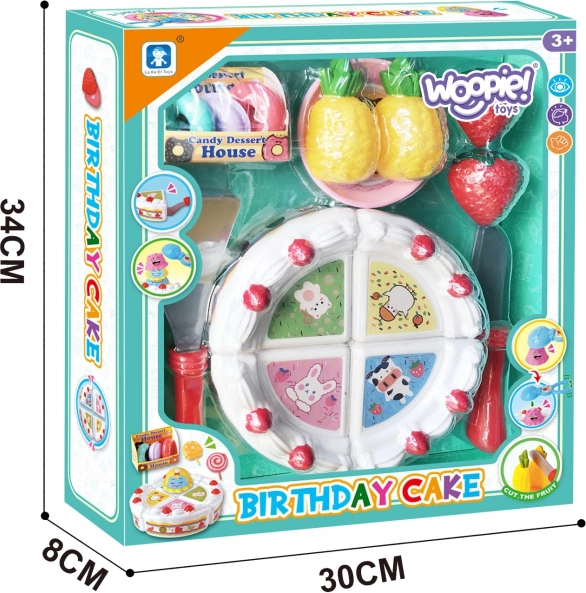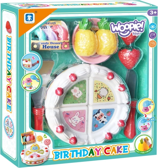 Det søde fødselsdagssæt fra Woopie forvandler ethvert børne-te-selskab til en uforglemmelig fest. Den smukt pyntede plastikkage til at skære deles let i portioner, og med tilbehør som kniv, spartel og tallerken kan børn øve sig i at servere som ægte værter.
