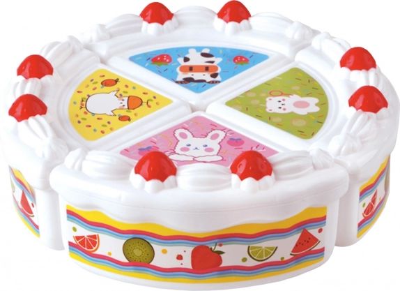 Den runde kage kan deles i enkelte stykker og serveres med kniv, spartel og tallerken – perfekt til træning af finmotorik og deling.