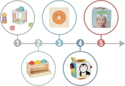 Legetøjet er farverigt, sikkert og ligger godt i små hænder. Takket være gennemtænkte aktiviteter træner børn både fin- og grovmotorik, koordination, farveopfattelse og rumlig forestillingsevne. Bogen med realistiske fotografier understøtter sproglig udvikling og kendskab til egen krop.