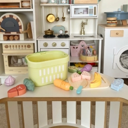 Sættet med træmad til skæring udvikler ikke kun børns fantasi, men støtter også udviklingen af finmotorik. Når børn bruger sættet, kan de forvandle sig til små kokke, hvilket fremmer deres kreativitet og sociale færdigheder gennem rolleleg i forskellige køkkensituationer. Leg med at skære og tilberede mad hjælper børn med at lære om sund ernæring og forstå forskellige typer fødevarer.