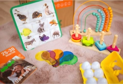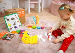 Uddannelsesboksen indeholder flere aktiviteter såsom sortering af former, dyrepuslespil og farvede optiske plader, som udvikler visuel forestillingsevne og finmotorik. Andre aktiviteter omfatter for eksempel et regnebræt med regnbue, der lærer enkel matematik, og en Montessori kuglebane, der forbedrer hånd-øje-koordinationen. Der er også bøger, som hjælper børn med at forstå forholdet mellem stort og småt, samt mange andre kreative øvelser.
