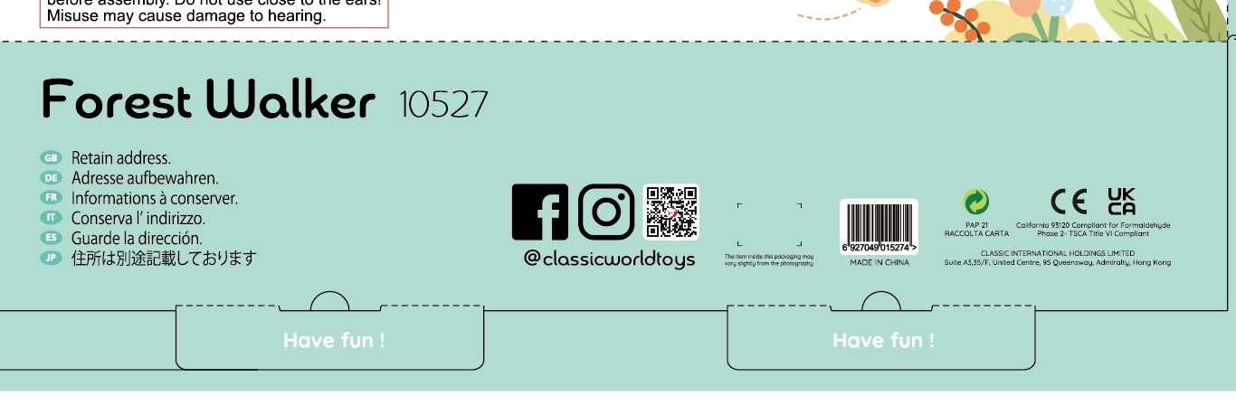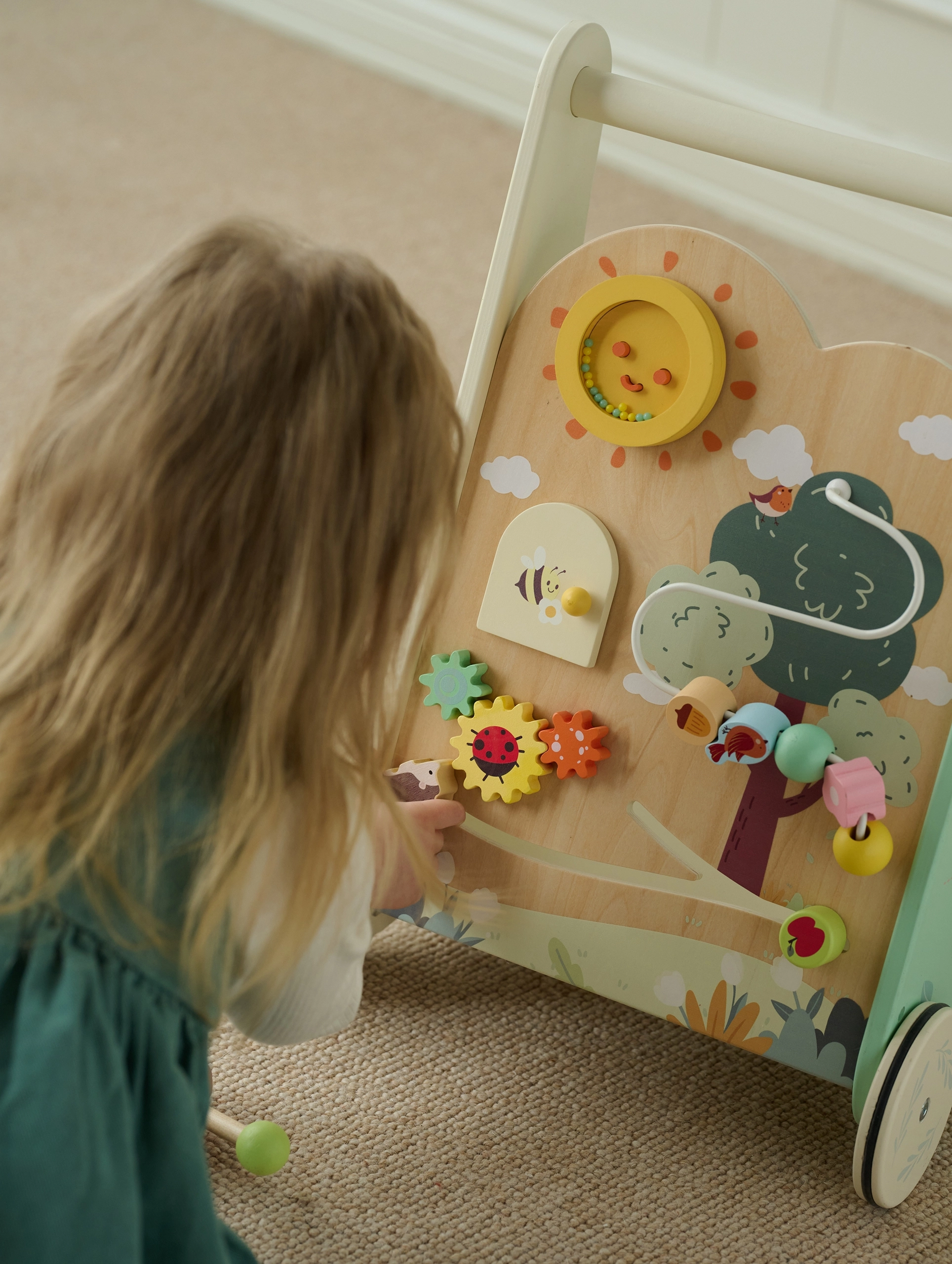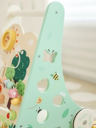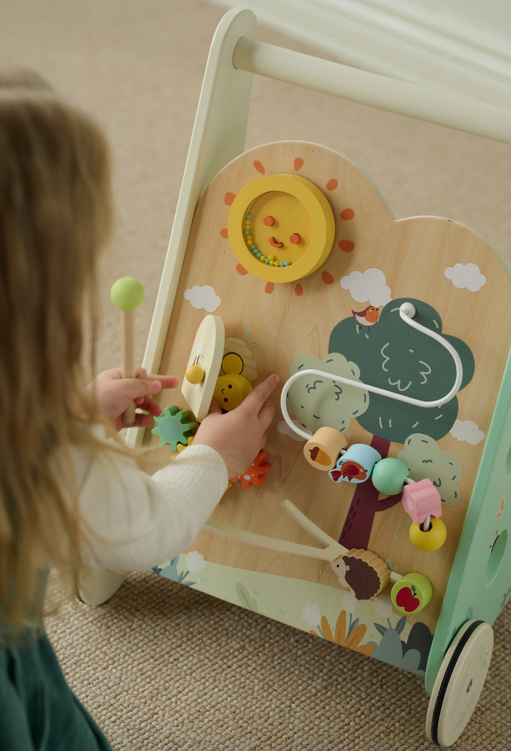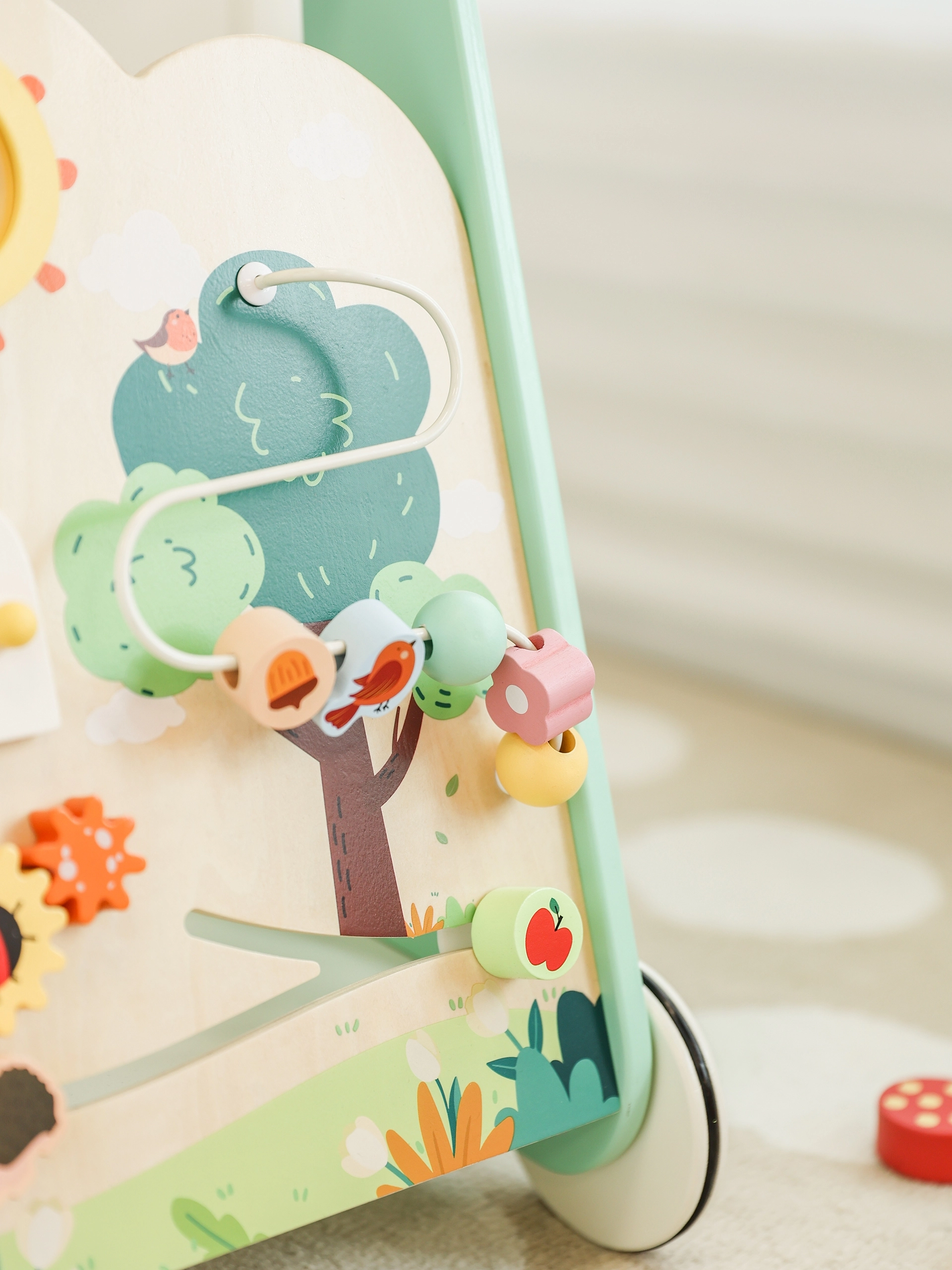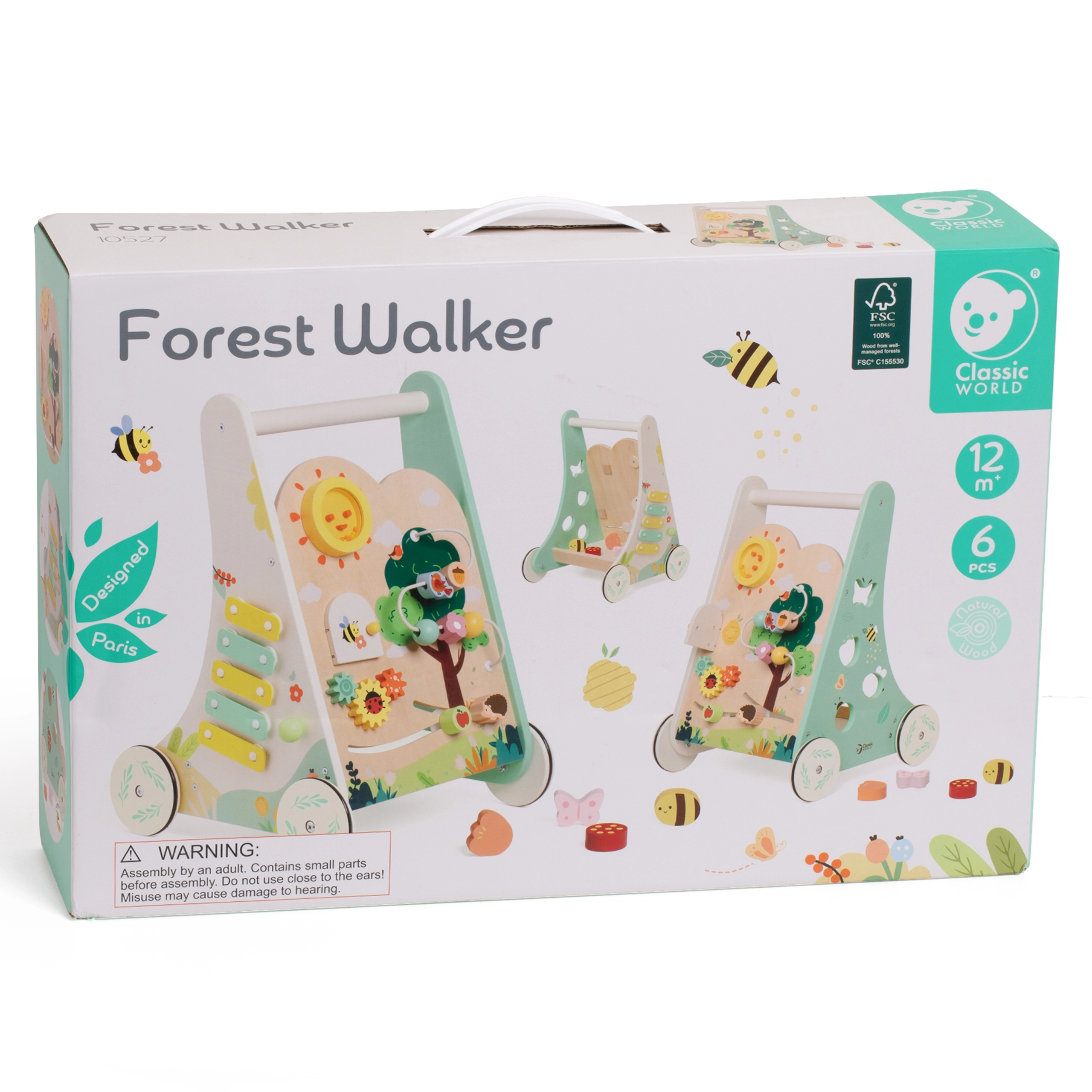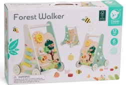 Træ-gåvognen CLASSIC WORLD Forest Walker støtter de første skridt og hverdagens opdagelser. Den robuste trækonstruktion giver tryghed og stabilitet, mens de stille gummibelagte hjul sikrer glidende og lydsvag bevægelse på gulvet. Farverige, interaktive elementer – xylofon, tandhjul, skydende perler og labyrinter – motiverer barnet naturligt til leg og læring.