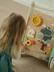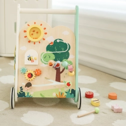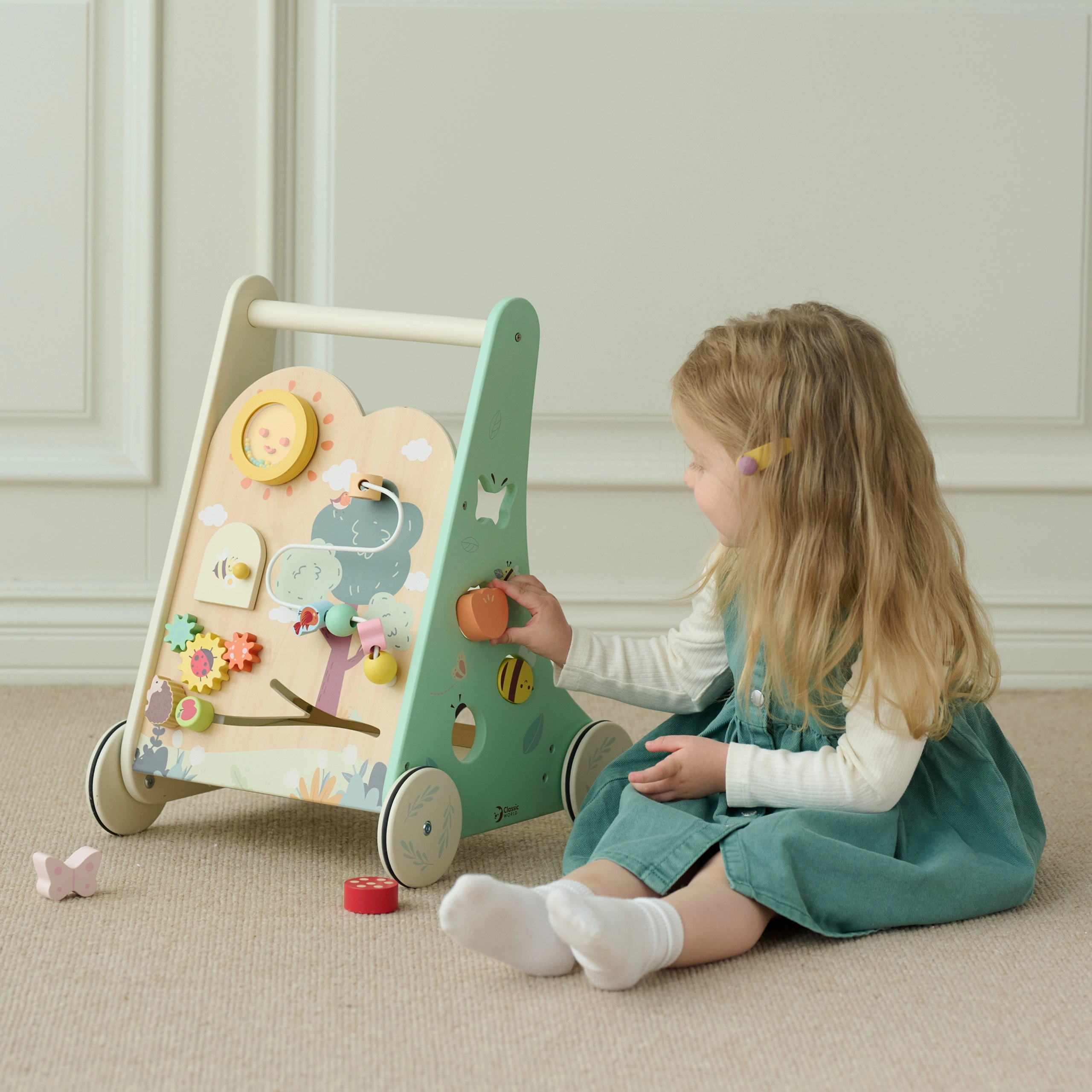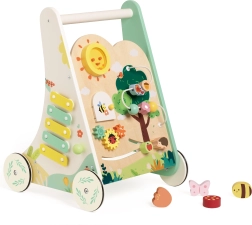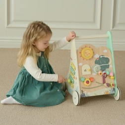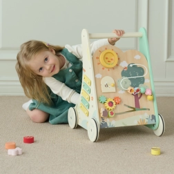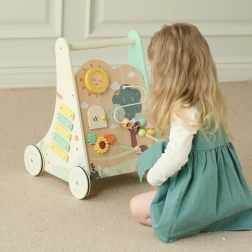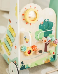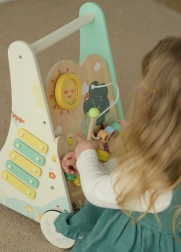 Gåvognen vokser med barnet: fra støtte ved gang til selvstændig leg med aktiviteter, der udvikler finmotorik, koordination, hørelse og logisk tænkning. Overfladerne er behandlet med sundhedsvenlige farver i blide, indbydende nuancer.