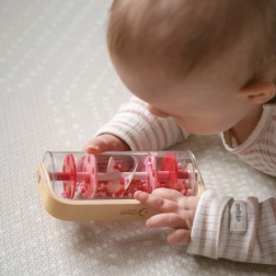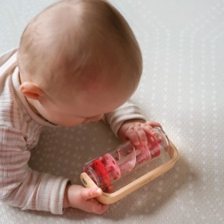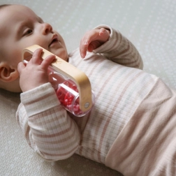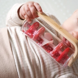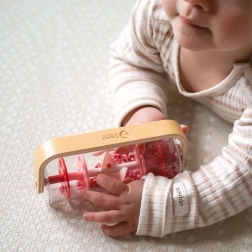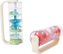 Denne røde regnstav kombinerer naturligt træ og en gennemsigtig krop fyldt med kugler, som bevæger sig jævnt ved bevægelse og skaber en afslappende, rytmisk lyd. Børn kan ryste, dreje 360° og se, hvordan perlerne bevæger sig fra toppen og ned – et fantastisk input til syn, hørelse og finmotorik.