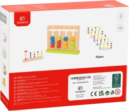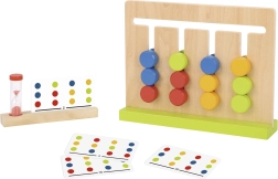 Dette læringsspil giver børn glæde ved at opdage og træner koncentration. Opgaven er, ud fra det valgte kort, at flytte farvede skiver i den rigtige rækkefølge og klare det inden for den tid, som timeglasset måler. Træudførelsen ligger godt i hånden, og overfladen er behandlet med ikke-giftige farver.