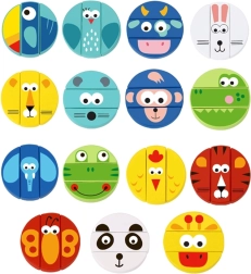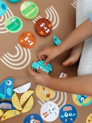 Sættet indeholder dyrekort og en farvet terning, der bestemmer, hvilken klods spilleren skal trække. Kvalitets træmateriale, glatte kanter og miljøvenlige, sikre farver sørger for en behagelig og sikker legeoplevelse. Spillet støtter samtidig læring af farver, tælling og tålmodighed.