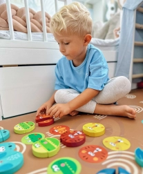 Kort og farvet terning hjælper børn med at genkende farver og sætte navn på 15 forskellige dyr. En sjov vej til at udvikle ordforråd og logik.