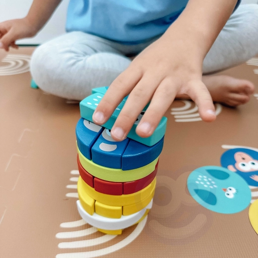 Dette fængende familiespil kombinerer balance, farvesortering og kendskab til dyr. Tårnet af farverige træklodser indbyder til forsigtig udtrækning og træner hånd-øje-koordination, koncentration og børns samarbejde. Ideelt til fælles leg mellem søskende og venner.