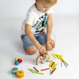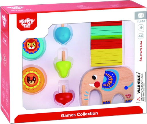 Opdag det alsidige træspilsæt fra TOOKY TOY, som giver børn timevis af kreativ underholdning. Den søde elefant fungerer som base til stabling, de farvede pinde kan bruges til mikado, og sættet indeholder også to yo-yoer og en snurretop. Legen styrker finmotorik, koordineringsevner og tålmodighed, er lavet af sikre og ikke-giftige materialer og udvikler logisk tænkning.
