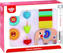 Dette farverige 46-dels træspilsæt kombinerer flere populære lege i én pakke. Børn kan balancere pinde på elefantens ryg, bygge tårne eller brønde, spille mikado, øve tricks med to yo-yoer og konkurrere om, hvis snurretop drejer længst. Ideelt til både selvstændig leg og familiekonkurrencer.