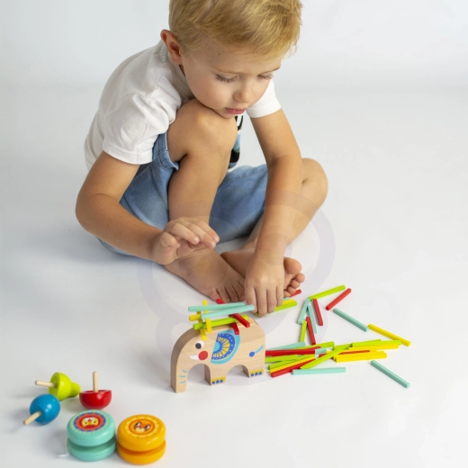 Elefanten i massivt træ fungerer som en sjov base til balancelege og stabling. Børn træner tålmodighed, balance og præcision, når de lægger de farvede pinde på plads.