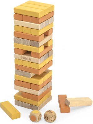 Byg starttårnet, træk forsigtigt én klods ad gangen, og læg den på toppen. Takket være de farvede klodser kan du tilføje et tilfældighedselement – kastet afgør, hvilken farve klods du skal fjerne. Spillet er perfekt for børn fra 3 år og voksne og byder på spændende underholdning, der træner tålmodighed og strategi.