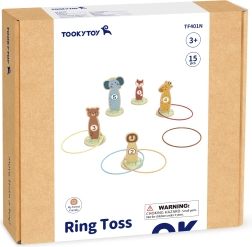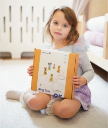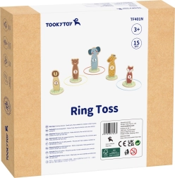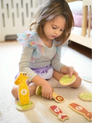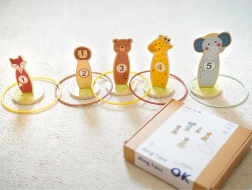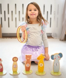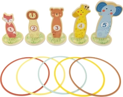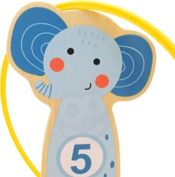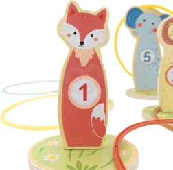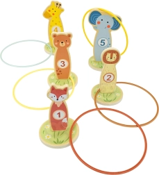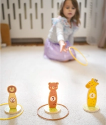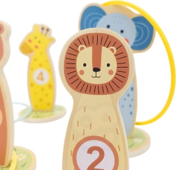 Dette trækastespil med kære dyr (ræv, bjørn, løve, giraf og elefant) lærer børn at ramme mål, udvikler finmotorik og koncentration. Hver målskive har et tal – barnet lærer naturligt at tælle point og planlægge næste kast. Delene kan opstilles frit, så det er nemt at variere sværhedsgraden.