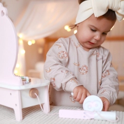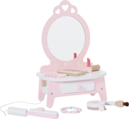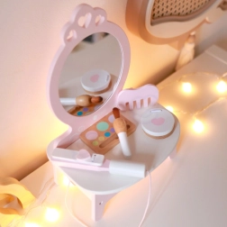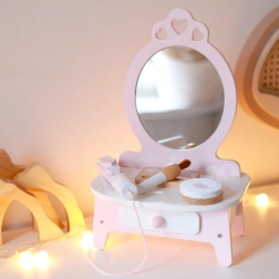 Dette smukke børnetoiletbord i lyserød farve er udstyret med spejl og 11 forskellige tilbehør, som inkluderer kam, læbestift, glattejern til hår, pudderæske og mere. Alle tilbehør er lavet af kvalitets træ og deres design i pastel farver giver legetøjet et magisk udseende. Toiletbordet tilbyder rigelig opbevaringsplads til alle dine lille models hemmelige skønhedstricks.