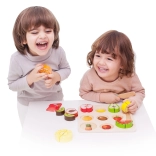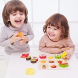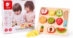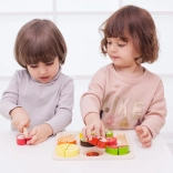 Sættet indeholder 20 dele inklusive en dobbeltsidet skæreplade, kniv og forskellige frugter. Dette sikre legetøj til børn fra 18 måneder er lavet af lakeret træ og malet med ikke-giftige farver, hvilket sikrer, at det er fuldstændigt sikkert at bruge.
